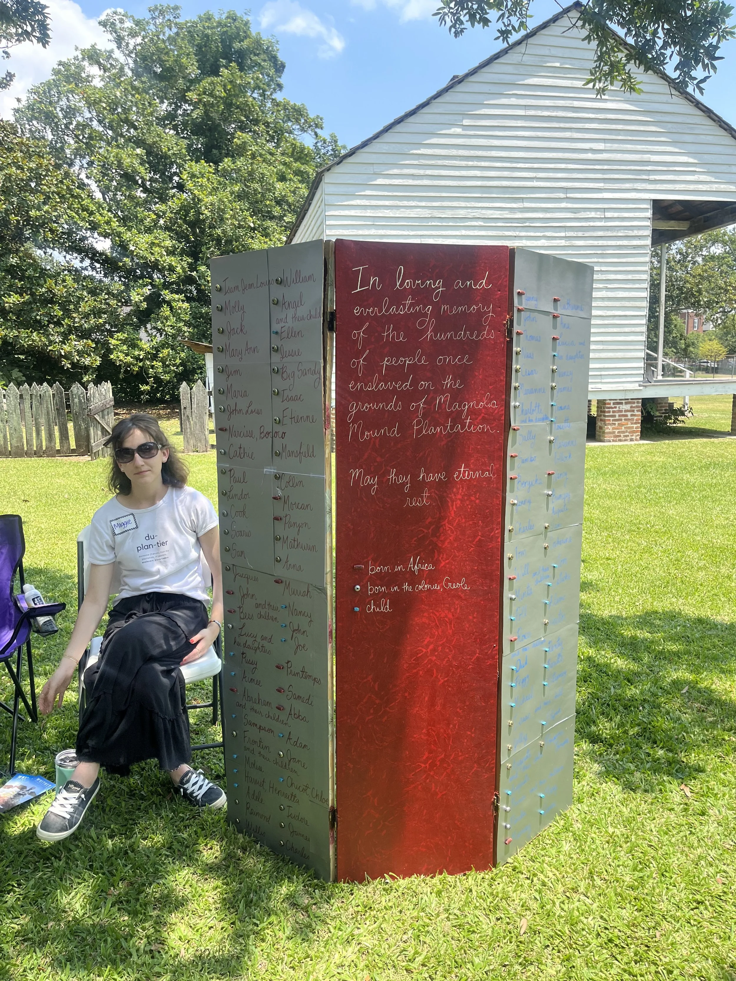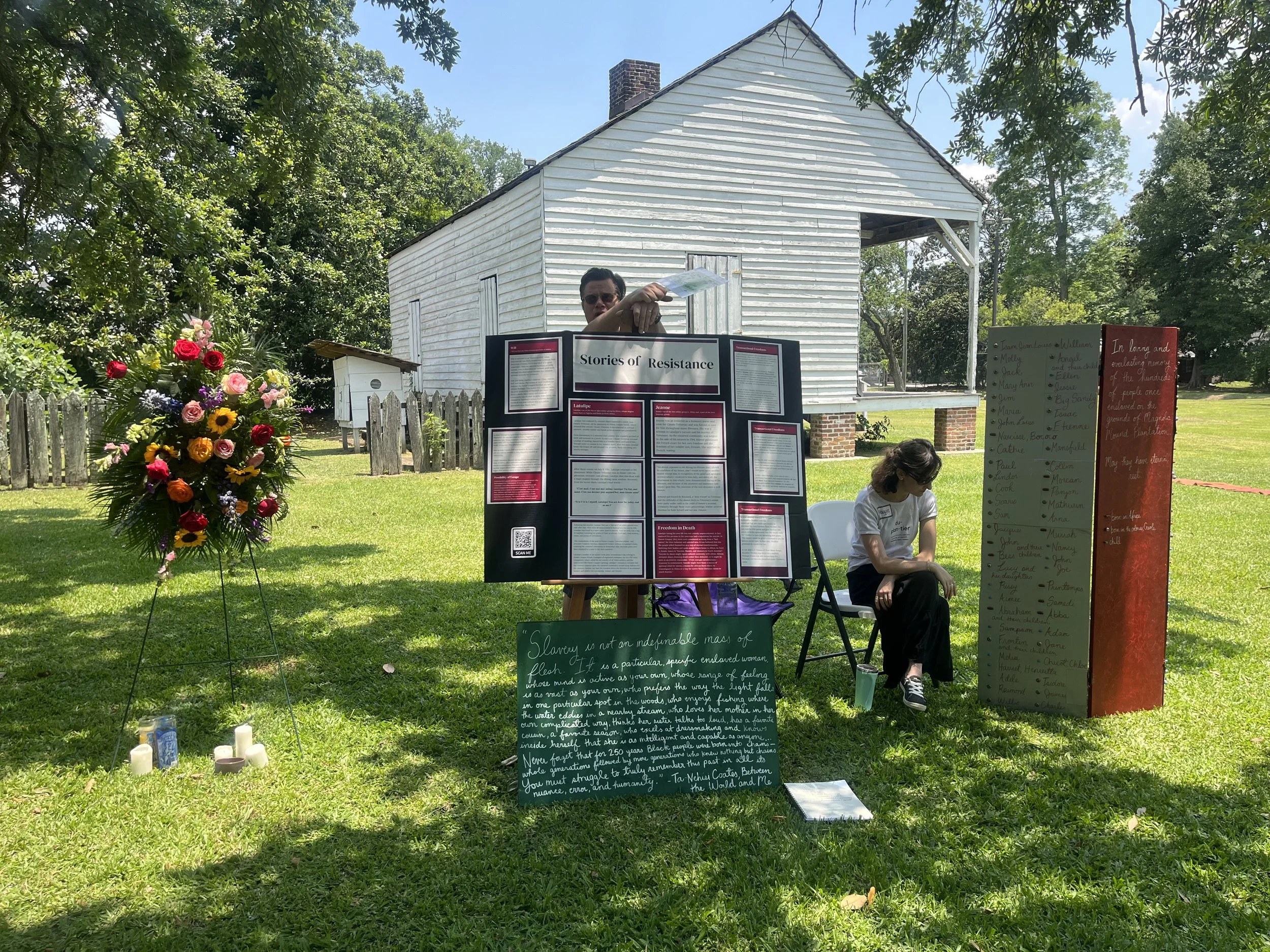 After the 2023 reunion, painful and honest discussions revealed that many cousins felt uncomfortable attending the reunion without proper acknowledgement of those once enslaved at the plantation. Sisters Lou and Maggie Duplantier helped prompt discussion by bringing to the reunion a handmade memorial naming and honoring almost 300 persons once enslaved on the site. Accompanying it was an educational display based on Lou’s graduate thesis that highlighted revolutionary acts and familial relationships of the enslaved community.